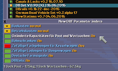 Also, wo ich jetzt diese speziellen Auswirkungen massiv verspürt habe (und eine schnelle Besserung nicht zu erwarten ist), habe ich in 0.9 eine alte Idee eingebaut, nämlich mehr "realitätsbezogene" Gewichte für Postsäcke und "Wertsachen-Beutel" (cargo properties 0B und 1D). Damit sollte man dann auch mit einem Pack/Gepäck/Postwagen pro Zug sinnvoll arbeiten können.