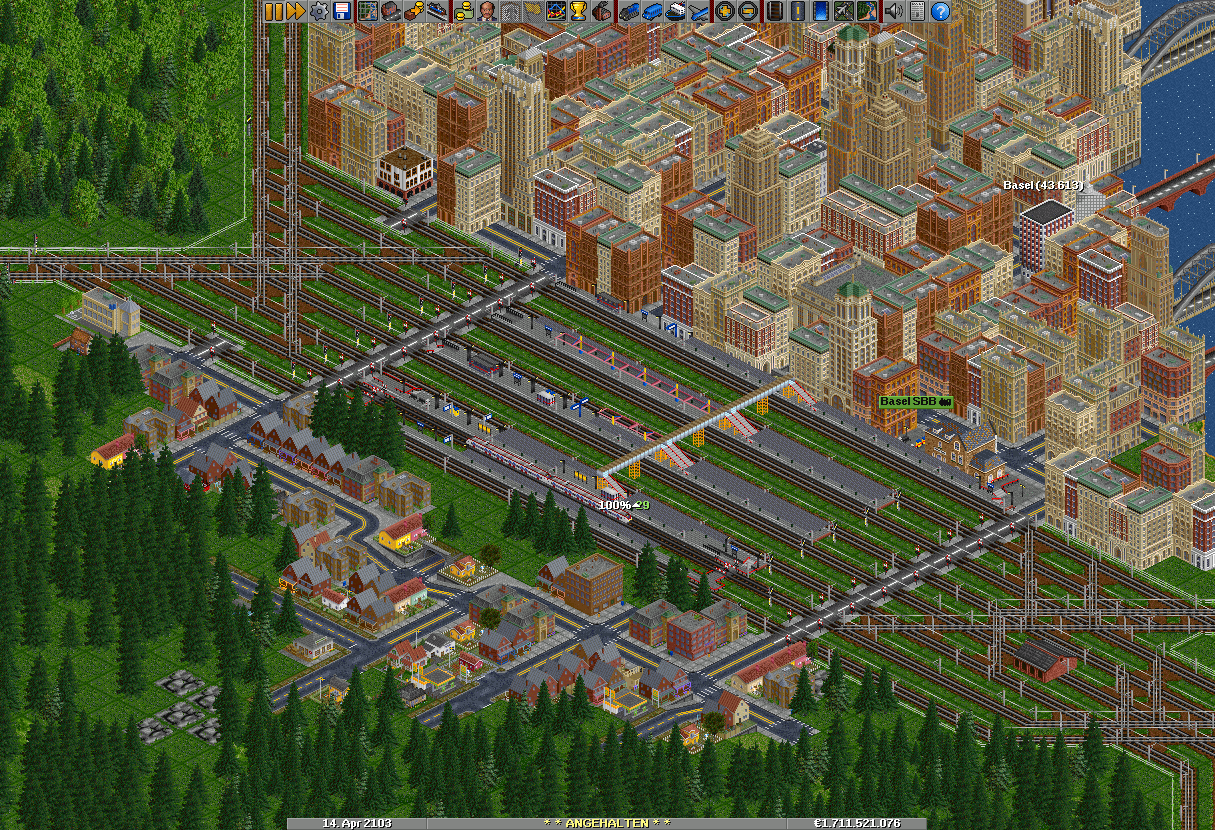 Der Bahnhof ist mit 6 Gleisen der zweitgrößte meiner Karte. Aufgrund des von Beginn an akribisch durchgezogenen Systems des integralen Taktfahrplans und Fahrplänen, die alle 3^n Monate lang sind, brauche ich aber auch nicht so viel Platz