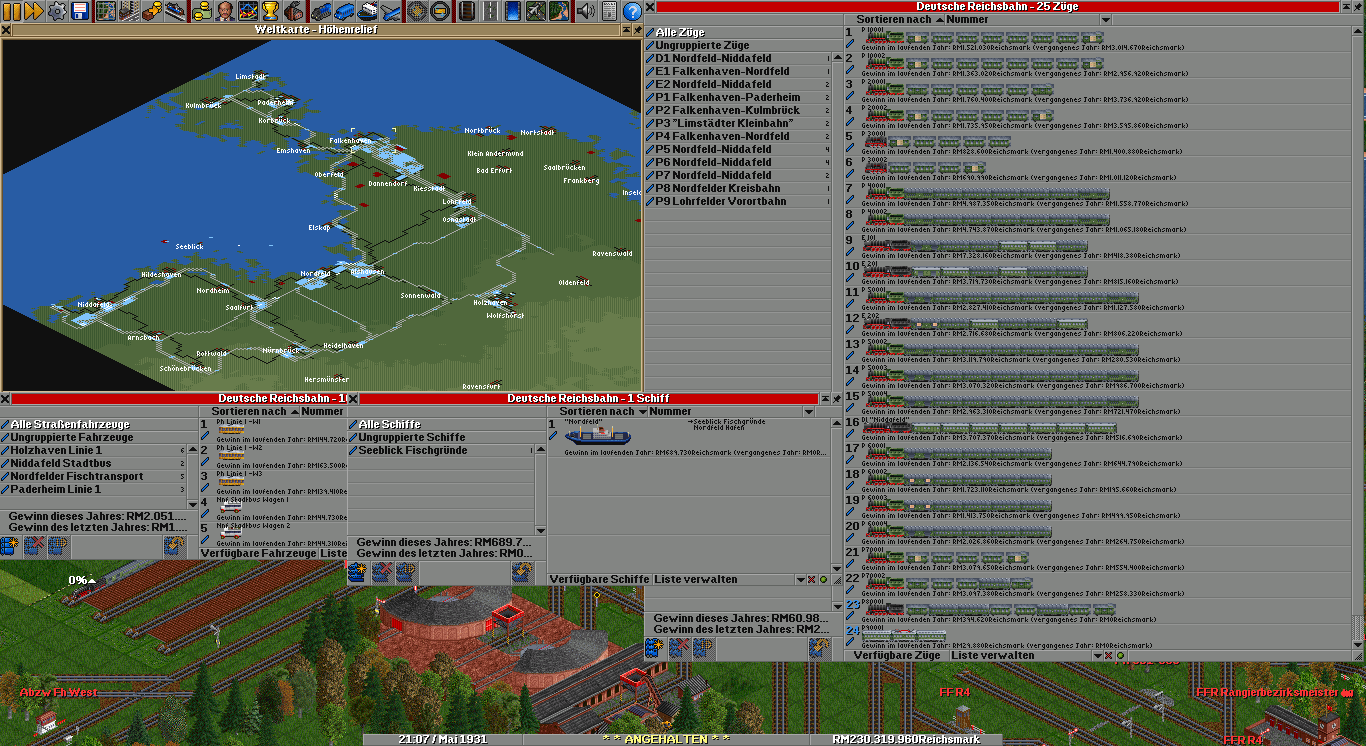 Beginnen möchte ich mit einer Gesamtübersicht über den Stand der Deutschen Reichsbahn 1931. Da ich diesmal daruaf verzichtet habe, auch für jede Stadt einzelne Verkehrsunternehmen zu gründen, verfügt die Reichsbahn nicht nur über die Eisenbahn, sondern auch über Busse, Strabsen und Schiffe, was ja nicht mal allzu realitätsfern ist Lächeln