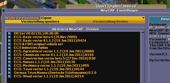 Denk auch auf jeden Fall daran, Fahrzeugsets einzubinden, die die vielen neuen Frachtarten unterstützen. Ohne entsprechende Fahrzeugsets wirst Du keine Freude haben. Nutzt Du das DB-Set, so willst Du auf jeden Fall das dazugehörige Add-On "DB Set ECS&FIRS Extension" mit zur NewGRF-Auswahl hinzunehmen.