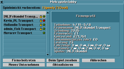 Ihr könnt dann eine neue Firma gründen oder einer andern Firma beitreten, wenn sie nicht passwortgeschützt ist. Ihr könnt aber auch nur beim Spiel zusehen.