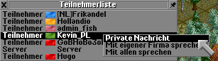 Wenn ihr jemandem eine private, nicht öffentlich sichtbare Nachricht schreiben wollt: oben in der Menuleiste auf das Gesicht und dann auf Teilnehmerliste klicken. Dort dann den Spieler auswählen dem ihr eine private Nachricht schicken wollt.