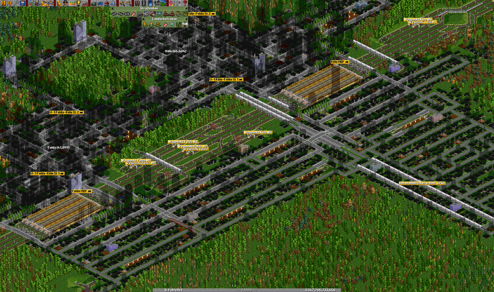Die Highscore besitzt bei TT zudem überhaupt keine Aussagekraft. Normalerweise hat man die 1000 Punkte, wenn man sich denn an den Kriterien messen will, so um 1970 zusammen. Wirklich gute TT-Spieler erreichen die 1000 Punkte dennoch nie, weil man bei einem großen Netzwerk praktisch immer ein, zwei Fahrzeuge drin hat, die sich irgendwie verirrt haben, wo eine Industrie dichtgemacht hat oder wo man einfach die Verluste in Kauf nimmt. Von auf Abstellgleisen geparkten Eyecandy-Zügen will ich da noch gar nicht anfangen...