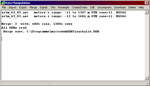 Als nächstes müssen die heruntergeladenen Dateien zusammengeführt werden. Klicke dafür auf File/Data manipulation. Klicke im neuen Fenster auf Merge/DEMs/DEMs--pick multiple. Wähle dann alle benötigten .asc Dateien aus mittels ctrl, und öffne diese. Diese werden nach und nach im Fenster eingetragen. Sind alle offen, wird nach dem Namen für die neue .asc Datei gefragt. Vergebe einen Namen, und klicke auf „Speichern". Warte einen Moment, bis das neue DEM erzeugt worden ist, das kann schon ein Weilchen dauern. Ist das Programm damit fertig sollten im Fenster dann folgende Informationen stehen: