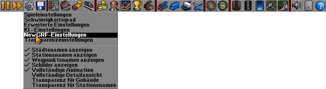 3. In der Menuleiste auf das Schraubenschlüssel-Icon klicken und gedrückt halten, Newgrf-Einstellungen auswählen