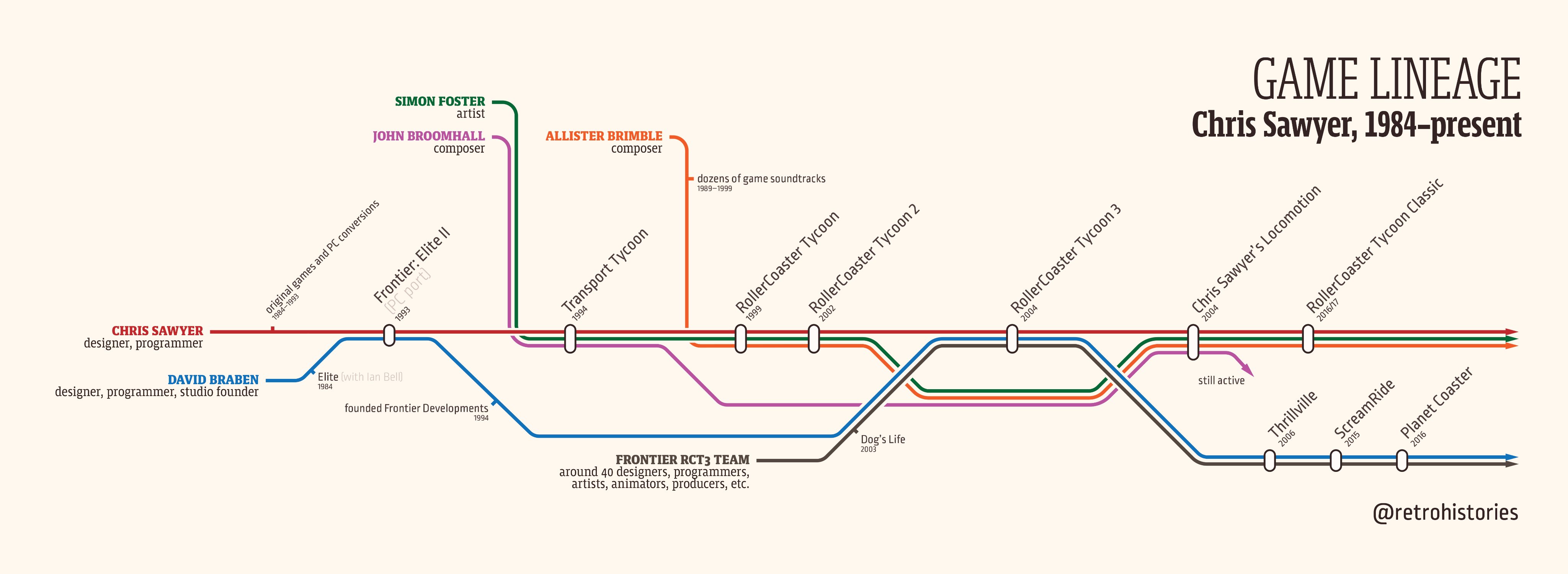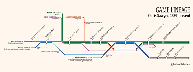 Chris Chapman hat die Spielehistorie von Chris Sawyer übersichtlich im Design einer U-Bahn-Karte dargestellt. Das ist zwar schon ein Jahr her, aber besser spät als nie...