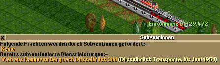 - Wenn in den Einstellungen zum Schwierigkeitsgrad der Subventionsmultiplikator hoch eingestellt ist, kann es sich lohnen, früh im Spiel (solange Geld noch knapp ist) subventionierte Strecken zu bedienen, um schneller an Geld zu kommen. Allerdings sollte man sich dadurch nicht von der eigenen Baustrategie ablenken lassen, denn Subventionen werden nur über einen sehr kurzen Zeitraum von einem Jahr ausgezahlt, danach sind die Einkünfte auf ehemals subventionierten Strecken wieder normal. Man verliert daher kaum etwas, wenn man Subventionen einfach ignoriert. Insbesondere im späteren Spielverlauf haben sie keine Bedeutung mehr.