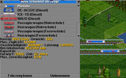 ich hab inzwischen auch noch eine kürzere Version in Arbeit. Ich finde nur die modernen Loks einfach zu kurz geraten. Ist ja nun mal eine Beschränkung in TTD, kann man also nur umgehen indem man die Loks zweiteilig macht. Und daran probiere ich mich gerade. Hatte ewig keine Zeit, aber Dank Michaels Gerüst (s. anderes Posting "Codinghilfe") hab ich es nun einigermaßen hinbekommen.