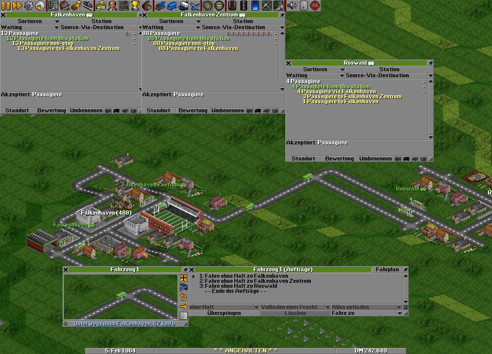 Du könntest z.B. lediglich Busse von Roswald nach Falkenhaven Zentrum und von Falkenhaven Zentrum nach Falkenhaven fahren lassen, dann würden Passagiere von Roswald nach Falkenhaven in Falkenhaven Zentrum umsteigen!