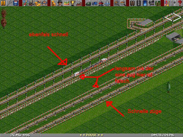 also ich hhab es so gemacht ich hab insgsamt 4 spuren, 2 für jede richtung die eine der 2 is für lagsame züge und und die andere nur für die schnellsten damit die langsamen züge die schnellen abbremsen.