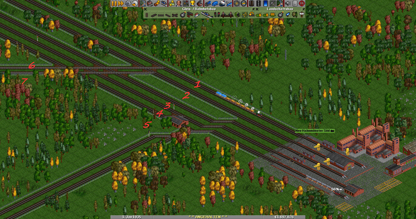 Ich habe vor diese Kreuzung zu bauen (screenshot). Nun habe ich das Problem, das ich nicht genau weiss wie ich die Signalsetzung am besten bewerkstellige um den Zug von Gleis 6 auf Gleis 1 fahren zu lassen und den Zug von Gleis 7 auf das 2te. Ohne das Die Fahrzeuge von Gleis 1 bis 5 in mitleidenschaft gezogen werden. Klar, kurze Wartezeiten sind nicht zu vermeiden. Aber keiner sollte irgendwie sinnloserweise abbiegen sonderen auf seinem angestammten Gleis bleiben.