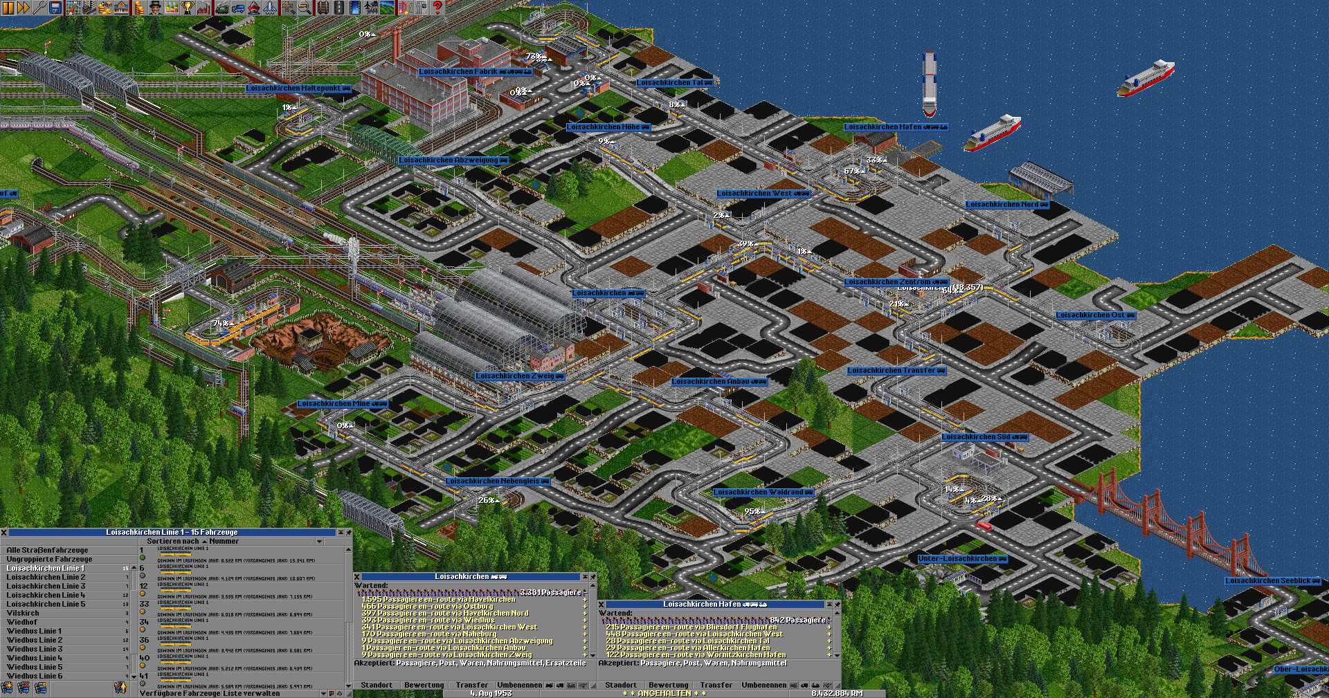 • Schiffe: Sehr langsam, aber dafür groß. Man kann ohne Probleme viele Schiffe auf eine Route schicken, ohne daß sie sich gegenseitig behindern, und damit riesige Mengen an Passagieren bewegen. Kapazitätsprobleme: Keine.