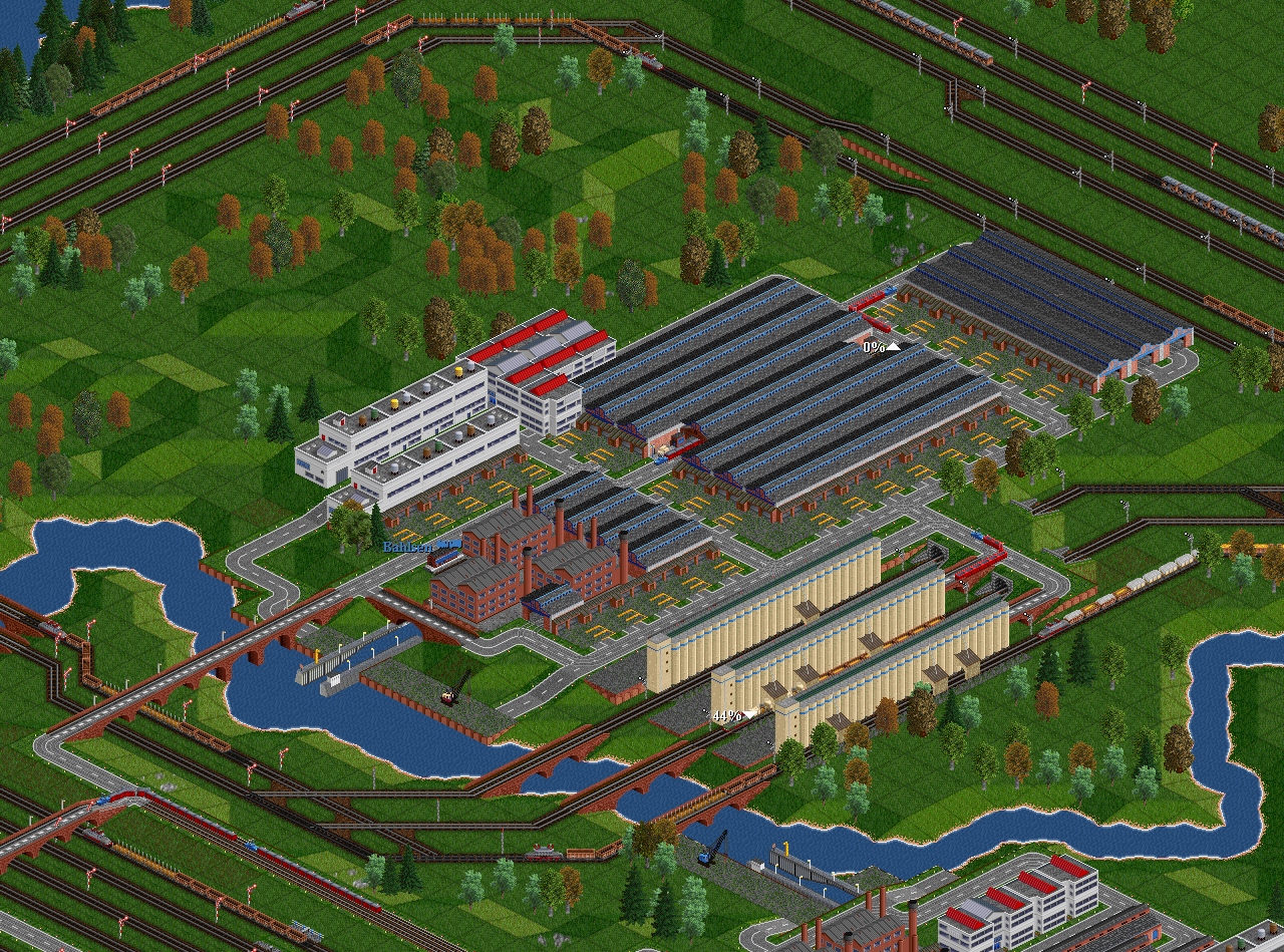 Nun sind auch endlich die Backfabriken, inklusive Netzanbindung und Landschaftschaftsgestaltung neu gestaltet worden. Dieses mal wollte ich die Werksbahn besser einbinden und habe ein bißchen mit dem Modular Locomotive Sheds experimentiert.