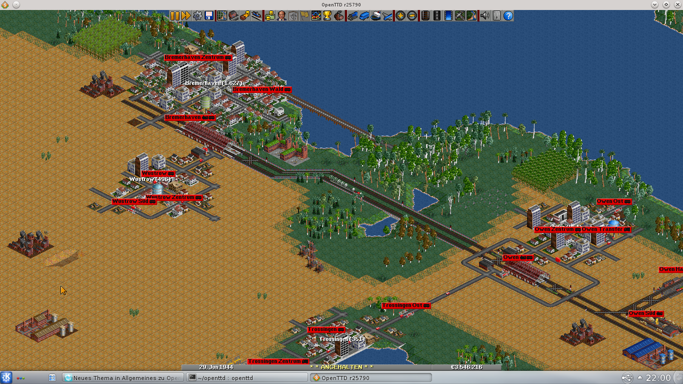 ich bin noch recht neu bei openttd, spiele grad mein erstes Spiel länger als die ersten 3-4 Jahre. Ich spiele mit cargodist und konzentriere mich zZ auch eher auf den Personenverkehr - alle Städte (bei denen es nötig ist) sind mit Wasser und Nahrung versorgt, ansonsten versuche ich den Passagieransturm zu bewältigen. Lachen