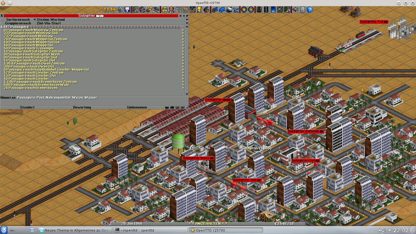 Von den kleinen Bahnsteigen gehen Personen-, Nahrungs- und Wasserzüge in die jeweilige Stadt, im großen Terminal kommen die Wasser- und Nahrungszulieferer an, außerdem gehen 3 Passagierzüge nach Salzgitter - meist gähnend leer.