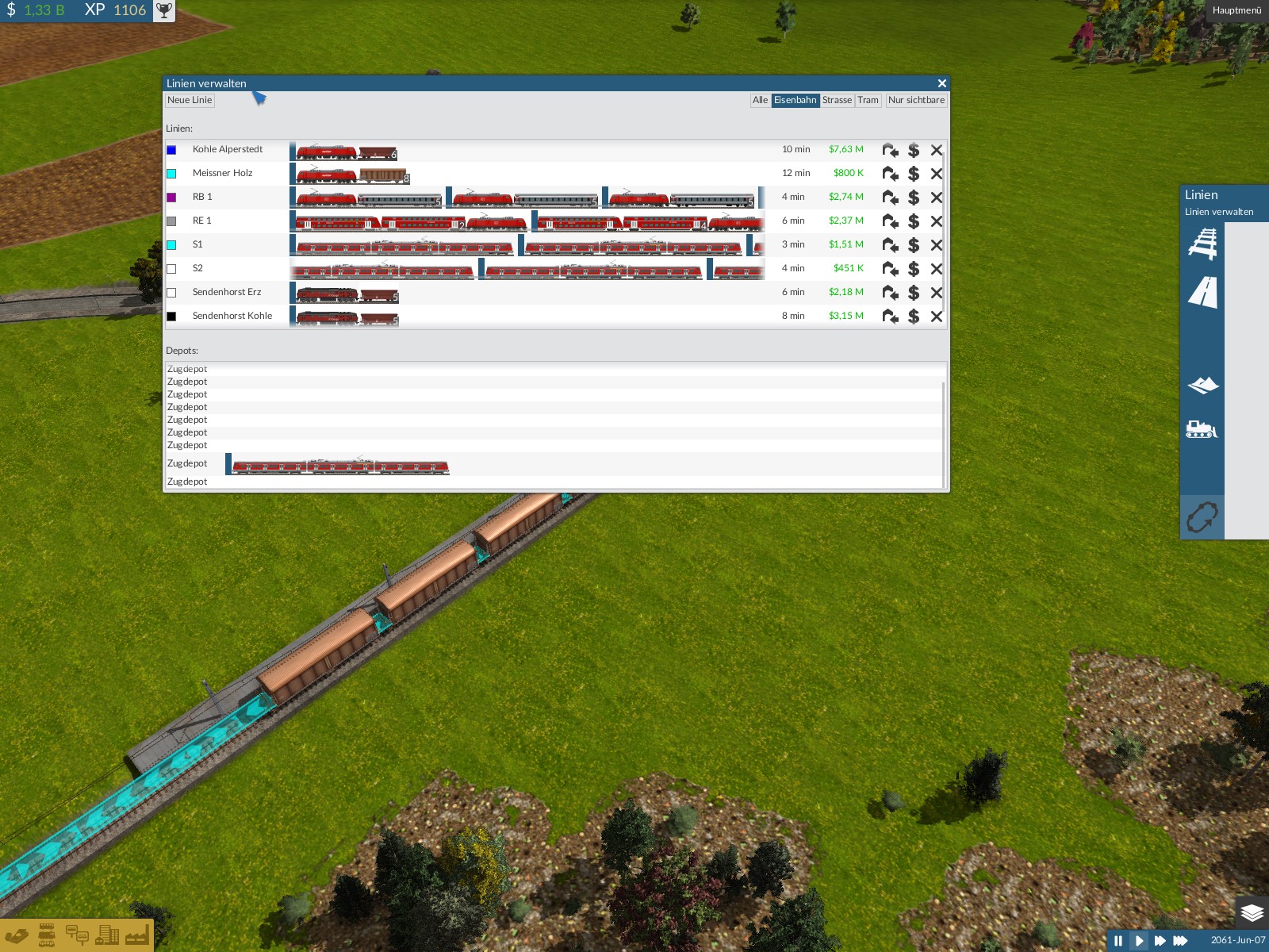 Mich stört z.B. dass man die Wirtschaftlichkeit bestimmter Linien schwer abschätzen kann. Insbesondere Güterzugstrecken sind abwechselnd in den roten und den schwarzen Zahlen. Evtl. sind die Jahre einfach viel zu kurz, weshalb die Züge nur eine Lieferung pro Jahr schaffen und auch so schnell veralten.