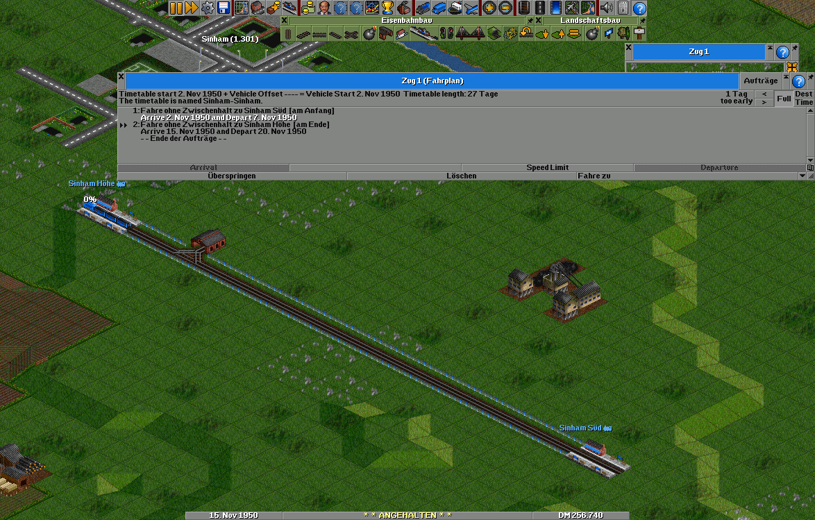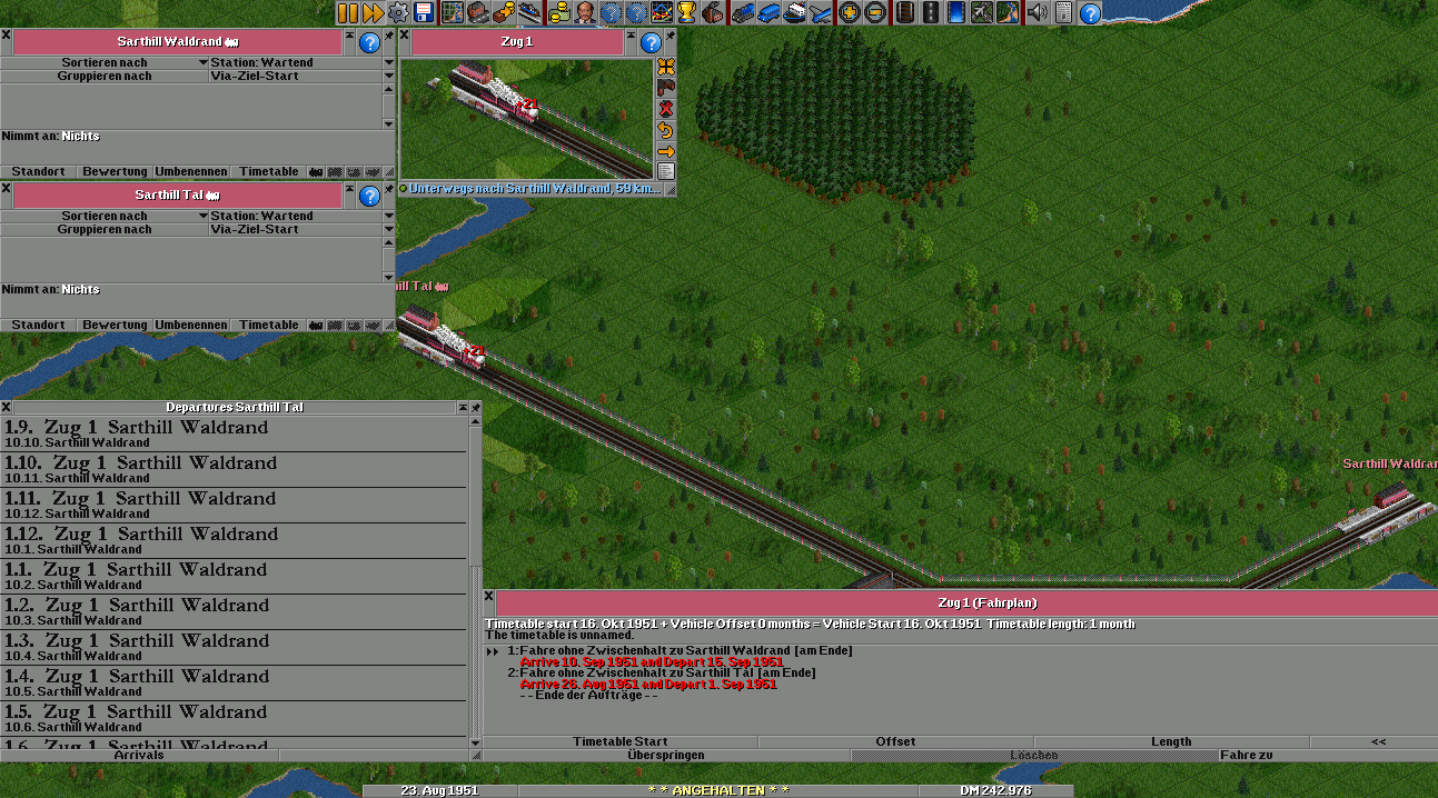 Das heißt, aus Sicht des Zugs betrachtet: Er wird am 15.9.1951 in Sarthill Waldrand abfahren, und kommt dann einige Zeit später in Sarthill Tal an, wo aber immer noch die Anweisung "Ankunft 26.8., Abfahrt 1.9." gültig ist.