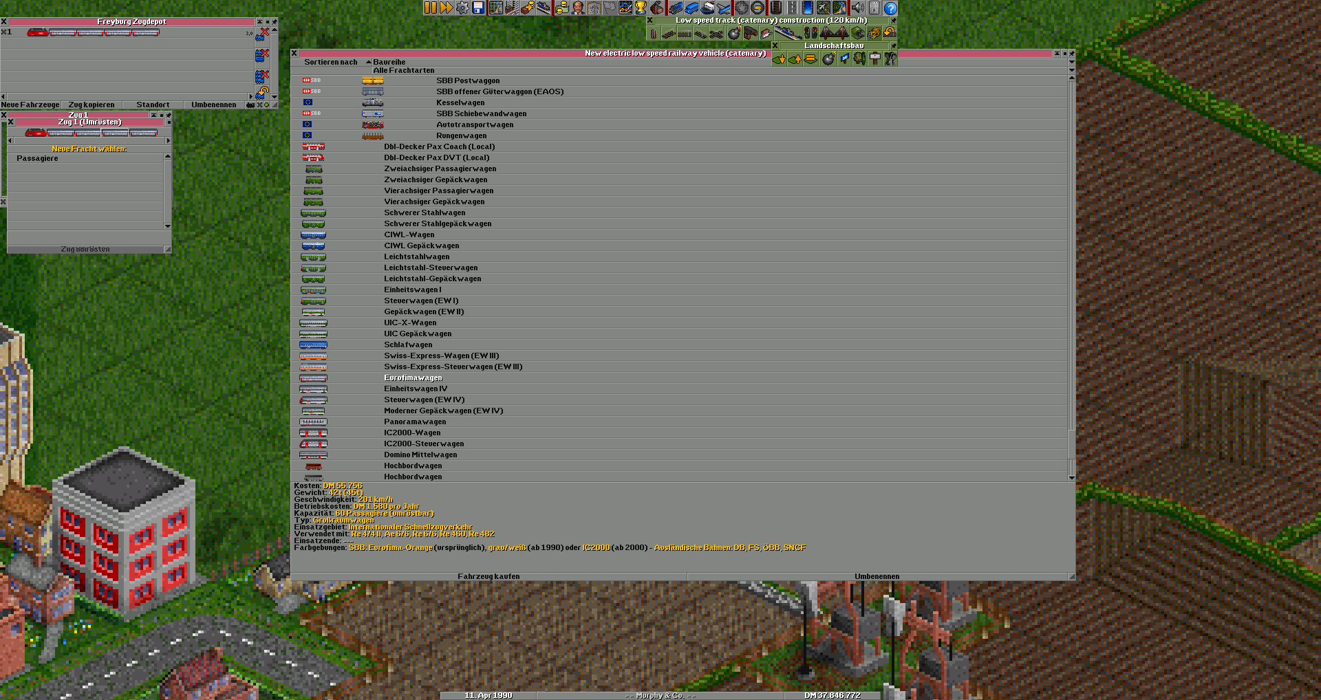 Weiterhin habe ich im Dezember 1946 (gerade eben habe ich es bemerkt) keinen Waggon, mit dem ich Gold transportieren könnte. Der Kühlwagen kann laut Kaufmenü umgerüstet werden (ohne Angabe), nach dem Kauf wird der Umrüstbutton angeboten, es wird aber nur die Standardfracht Lebensmittel angeboten. Die Flachwagen lassen sich auf Holz und Steel (statt Stahl) umrüsten.