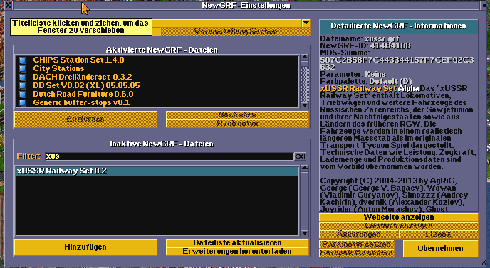 möchte ich das Szenraio spielen, sagt mir OpenTTD das die xussr.grf fehlt.