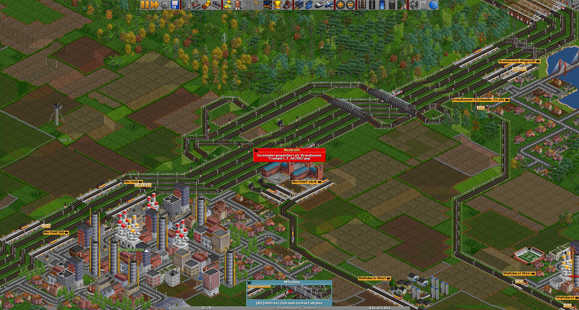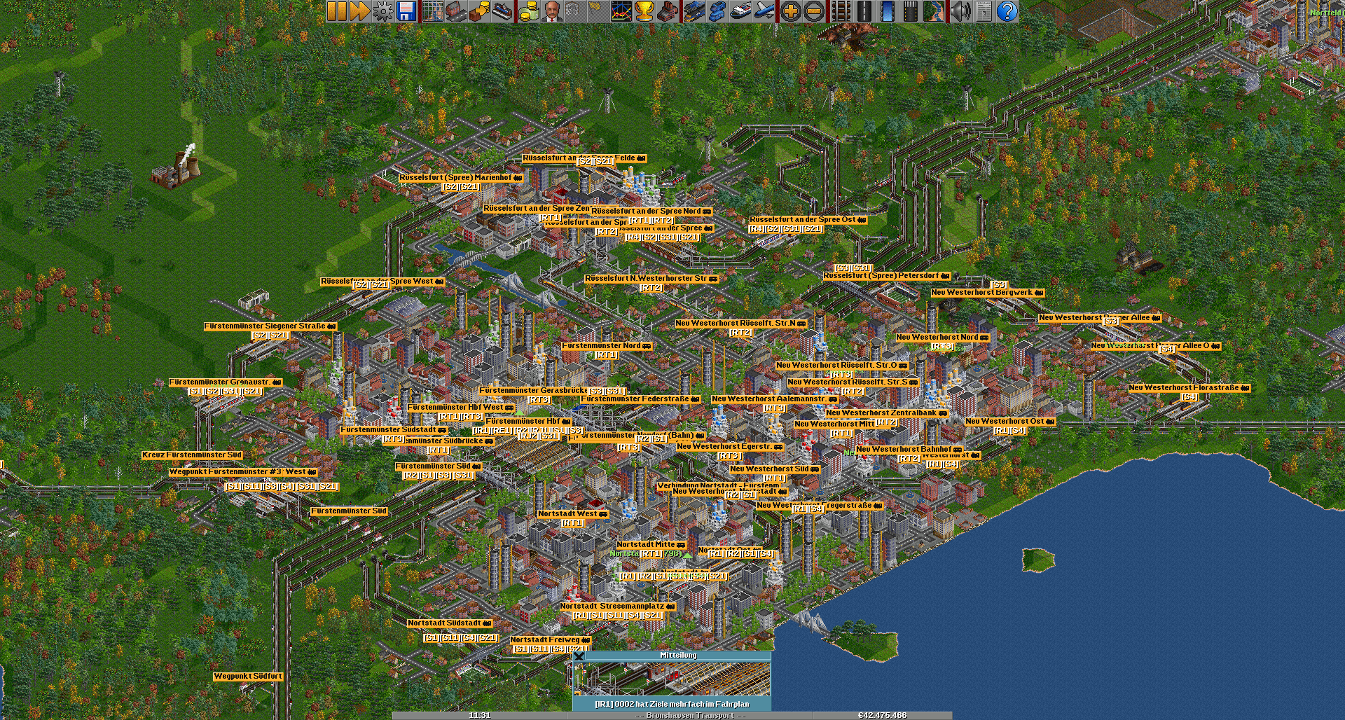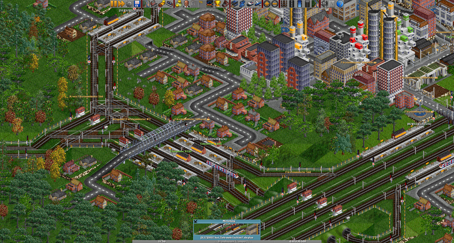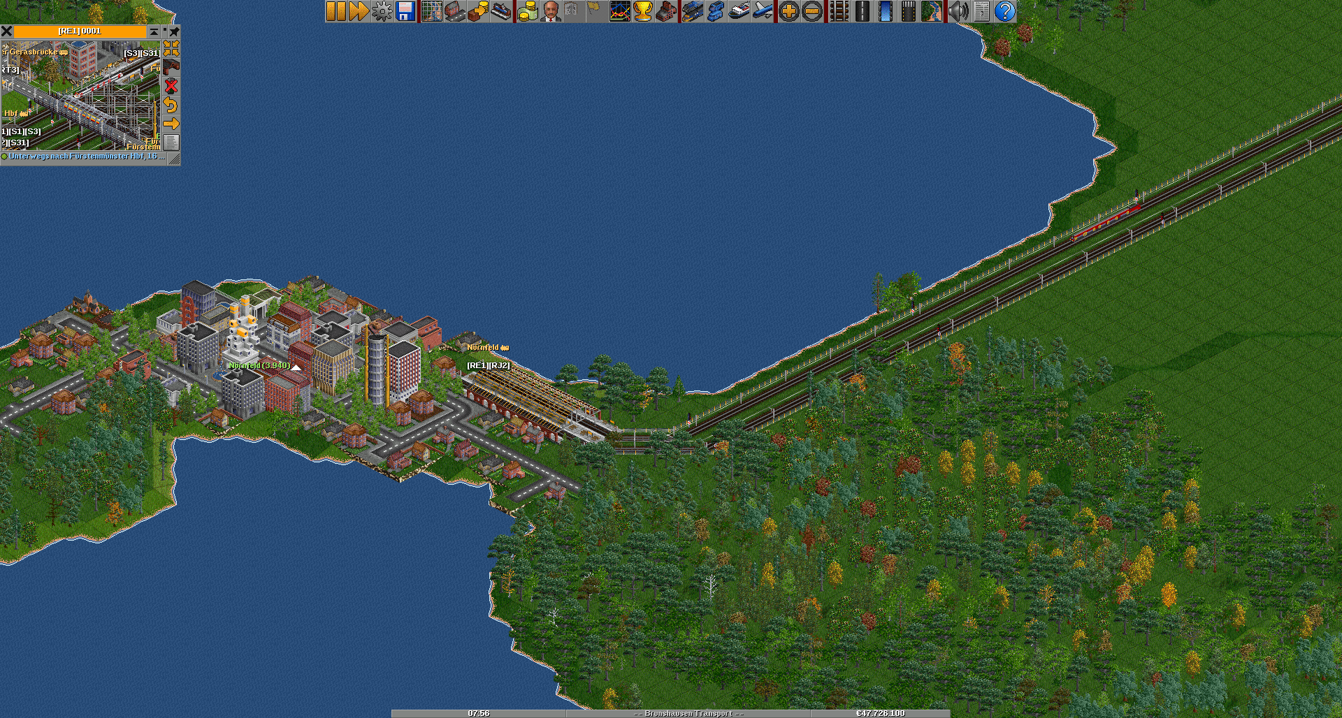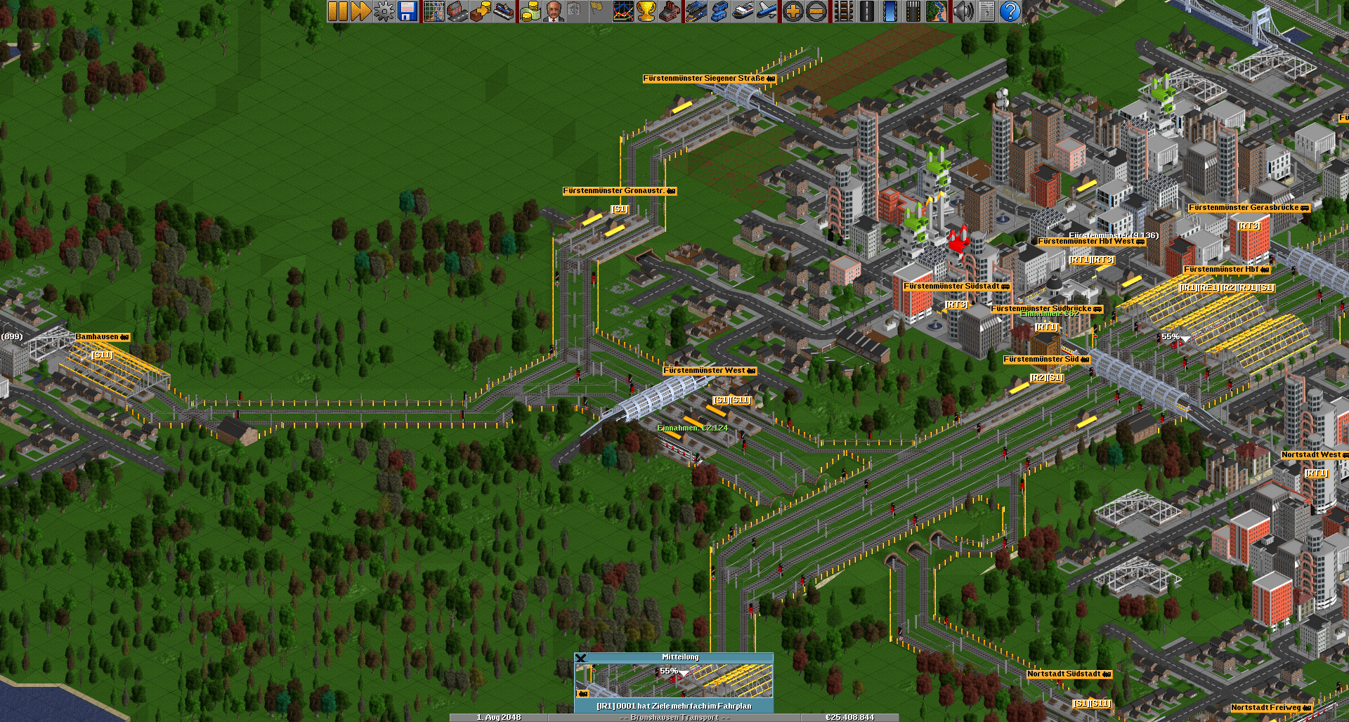 Nach Fürstenmünster wird's zweigleisig, hier zweigt auch die Güterzuglinie zur Fabrik ab und man kommt in Südfurt an. Diese Stadt hat eine nicht so gute Anbindung wie die übrigen Städte. Da uns jedoch ein gutes Image wichtig ist, werden wir hier in Zukunft einen besseren Regionalverkehr anbieten, so wird die R2 durch ein weiteres Zugpaar ergänzt und vielleicht auch der RE1.