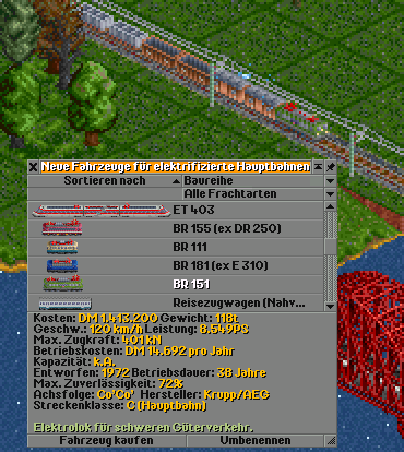 • Zur 143/112: Der Haken ist eben, dass die 143 nur 120 km/h fahren darf, die 112 aber 160. Da gibt es im Spiel eben dann einige Jahre außer der BR 120 keine schnelle Elektrolokomotive zu kaufen. Ich verstehe es doch richtig, oder, dass man Fahrzeuge nur im Kaufzeitraum, aber nicht im Auslaufzeitraum kaufen kann? Sonst wäre meine Klage überflüssig, man könnte ja dann weiterhin die BR 111 kaufen. (Ohne „Fahrzeuge veralten nie“, versteht sich)