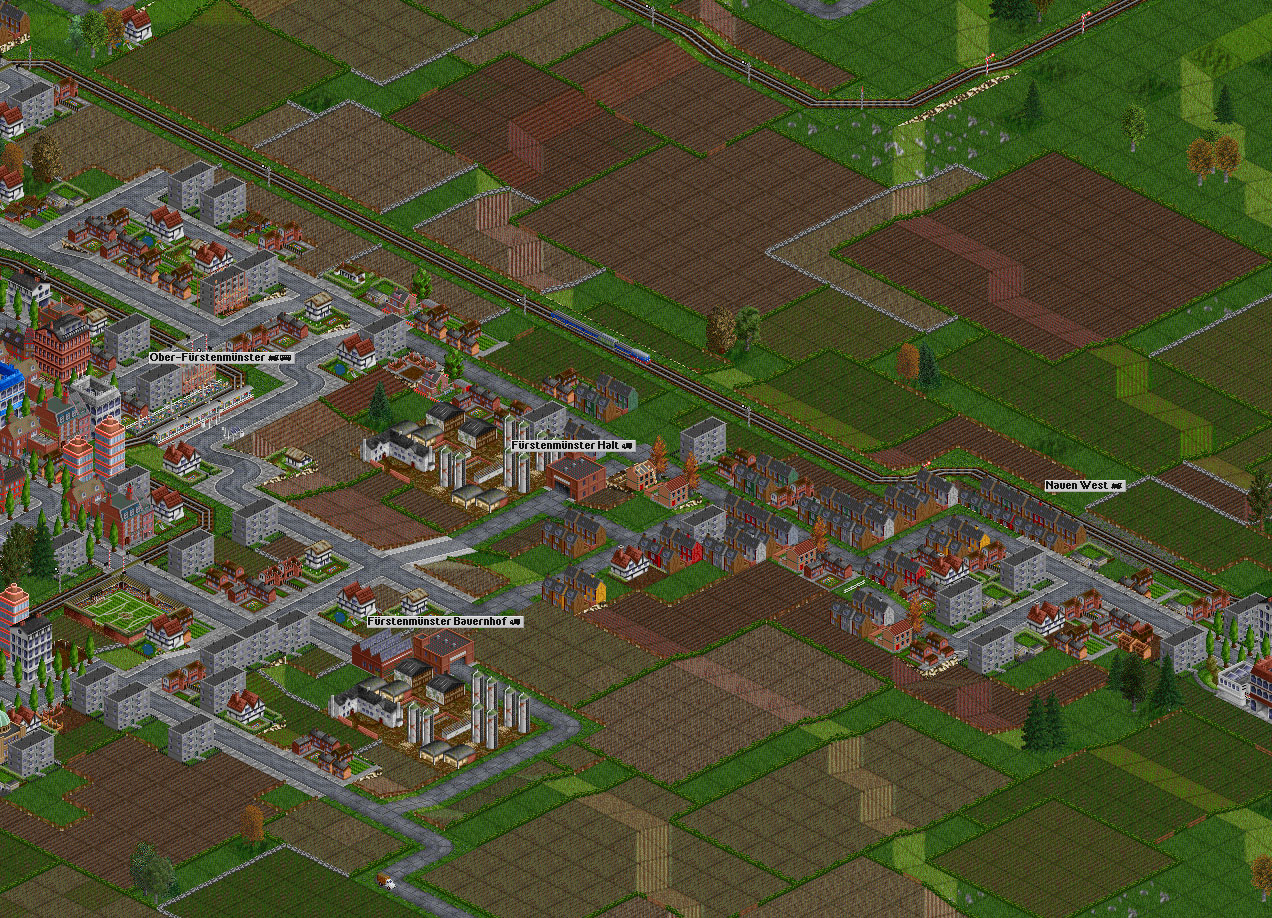 Trotz seines Status' als Metropole behielt Fürstenmünster einen gewissen ländlichen Touch im Südosten. Entlang der Gleistrasse in Richtung des Nauener Fernverkehrbahnhofs verkehrt ein Privatzug einer kleienren örtlichen Eisenbahngesellschaft, während im Hintergrund die schweren Güterzüge vorbeipoltern. Die Bauernhöfe vor der Stadt werden kaum kommerziell genutzt, sie dienen eher als Rückzugsort aus der Großstadt.