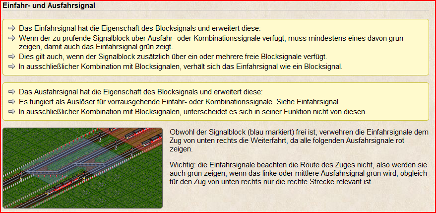 Es geht mir schlicht darum, dass ich mit Ein- und Ausfahrtssignalen experimentieren wollte und diese sich genauso „dumm“ verhalten, wie normale Blocksignale. Der Grund könnte sein, dass der Zug immer nur ein Feld weit sieht. Damit diese Signale funktionieren MÜSSEN sie auch bis zum nächsten Signal sehen können, weil ja sonst die Weiche nicht richtig gestellt wird.