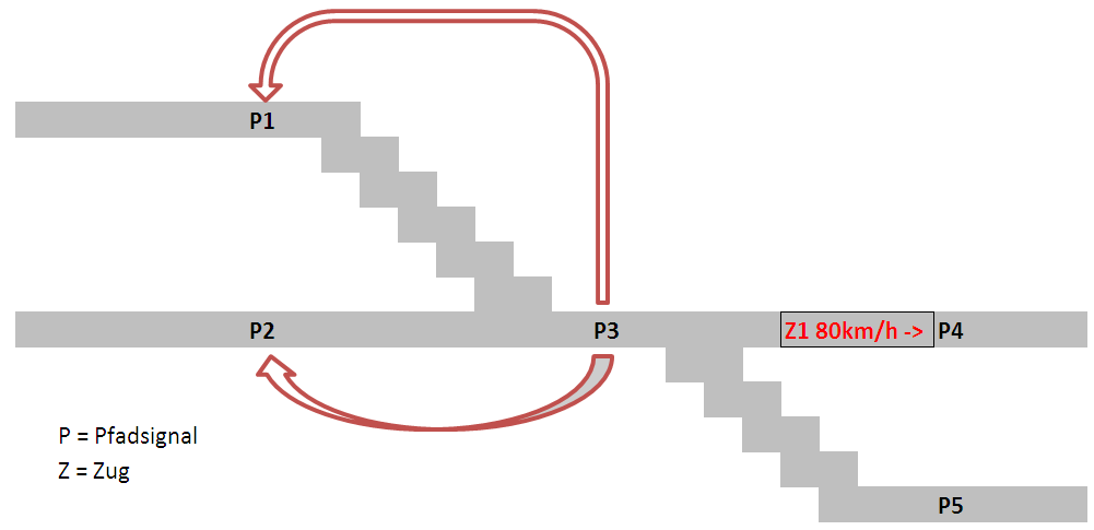 Ein Zug fährt mit 80 km/h über die Signale P1-P3 und befindet sich kurz von P4. Beim Durchfahren von P3 misst dieses die Geschwindigkeit und übermittelt sie an die voranstehenden Signale P1 und P2. Diese speichern die Geschwindigkeit für einen kurzen Zeitraum. Ein Zug der nun innerhalb diese Zeitraums P1 oder P2 passiert erhält 80 km/h als Höchstgeschwindigkeit bis er vom nächsten Signal (P3, welches Informationen von P4 erhalten wird) eine neue Geschwindigkeit erhält. Das Problem dabei ist, dass auch Züge ausgebremst werden, die den freien Pfad nach P5 nutzen wollen.