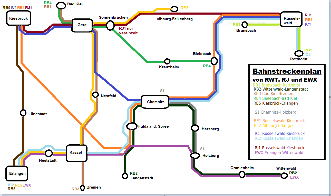 Die Hauptstrecke Rüsselswald-Chemnitz führt über Bielebach, wo die RB4 abzweigt.(Zur besseren Übersicht empfehle ich den streckenplan im 1. Post). Auch zu sehen ist Brunsbach, Endpunkt der RB1.