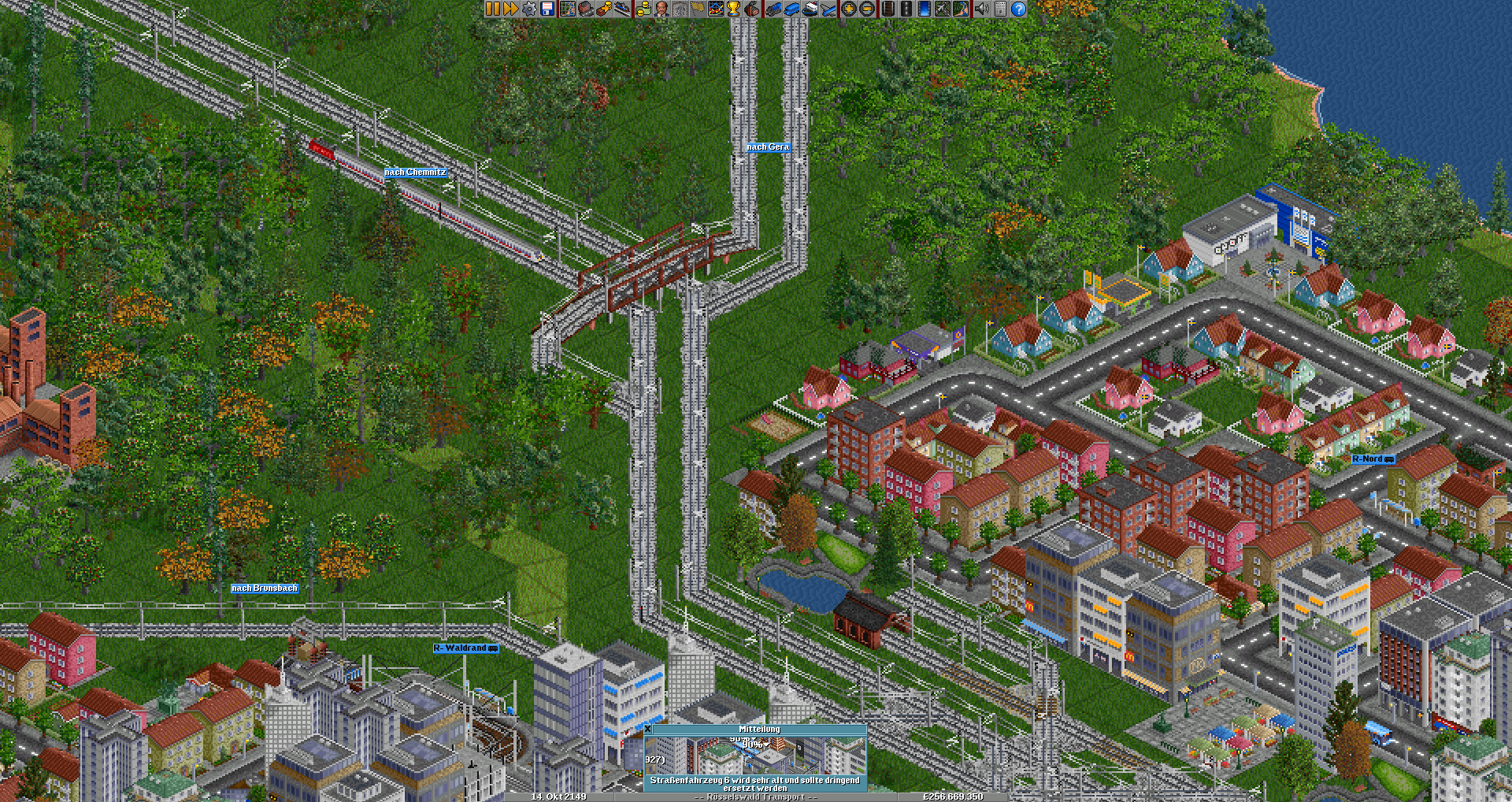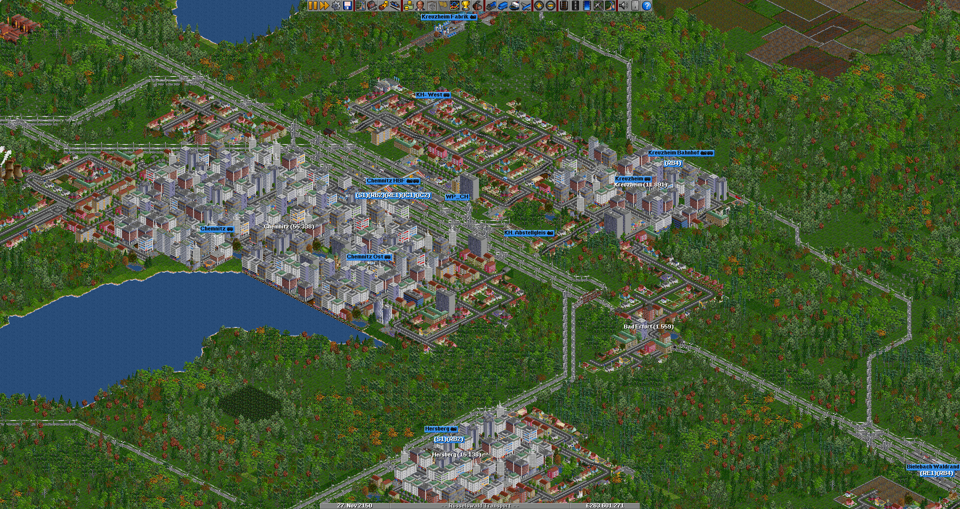 Ich möchte euch hier meine erste richtig große Map vorstellen. Fast alle Städte und Dörfer haben einen Gleisanschluss, kleinere Orte sind mit Bussen angebunden. Ich verwende derzeit weder Cargodist noch Fahrpläne,